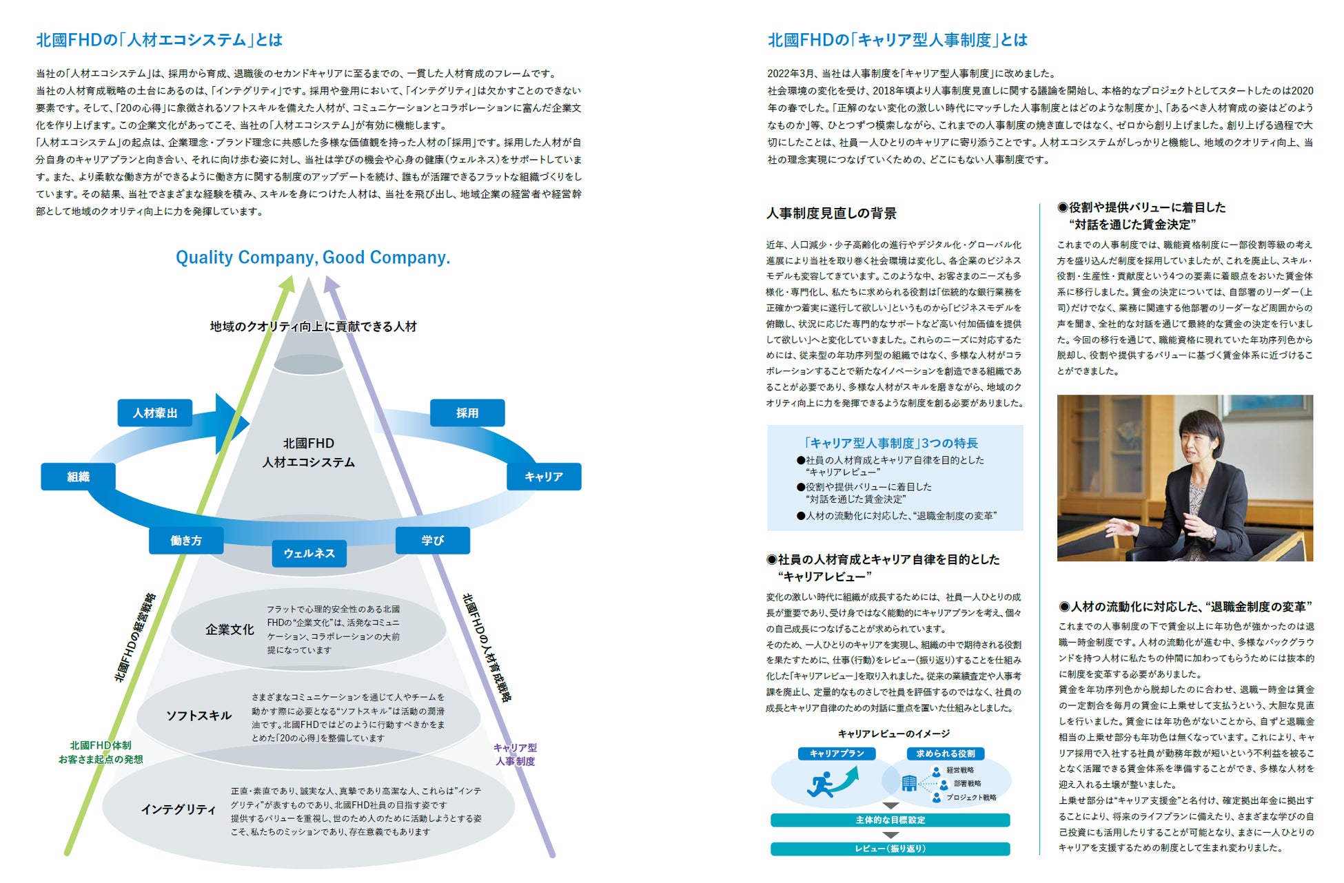当社では、「地域のクオリティ向上に貢献できる人材の育成」に取り組んでおり、積極的に推進している人的資本経営について、詳細に記載しています。独自に定める「北國FHDの人材エコシステム」の各項目(採用・キャリア・学び・ウェルネス・働き方・組織・人材輩出)ごとの戦略や取組み内容をご説明しました。