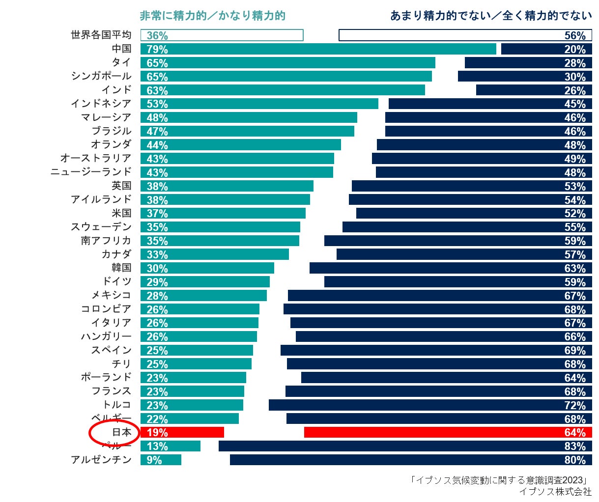 「政府は気候変動対策にどの程度精力的に取り組んでいると思いますか?」という設問に、「非常に精力的」「かなり精力的」と答えた日本人は、19%。31カ国中3番目に低い数字で、世界各国平均(36%)を大きく下回っています。