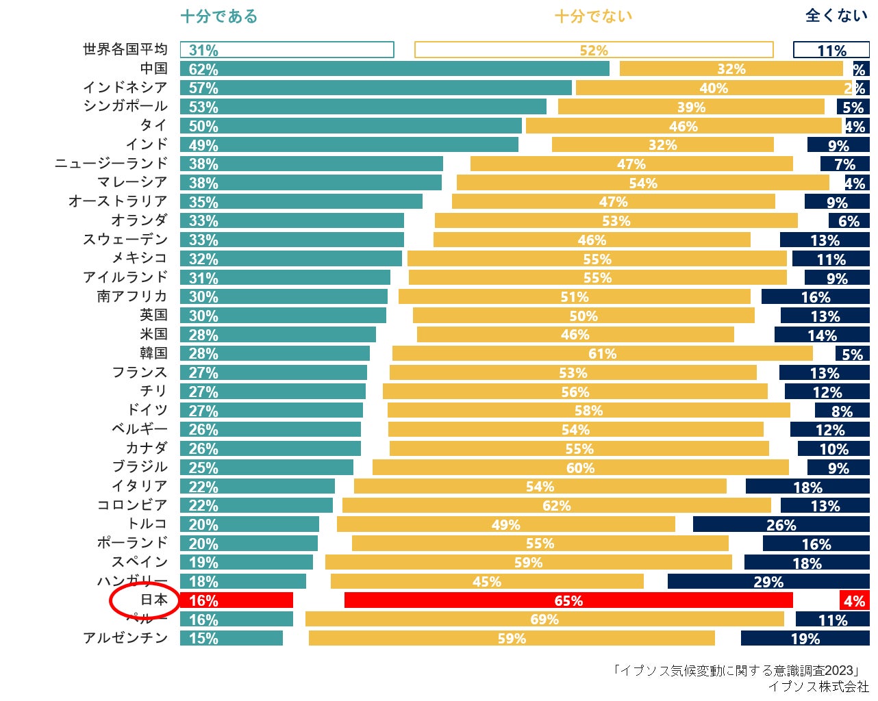 「気候変動の潜在的な影響について、政府はどの程度十分に情報を随時提供していると思いますか?」という設問に「十分である」と答えた日本人16%。31カ国中2番目に低い数字である。