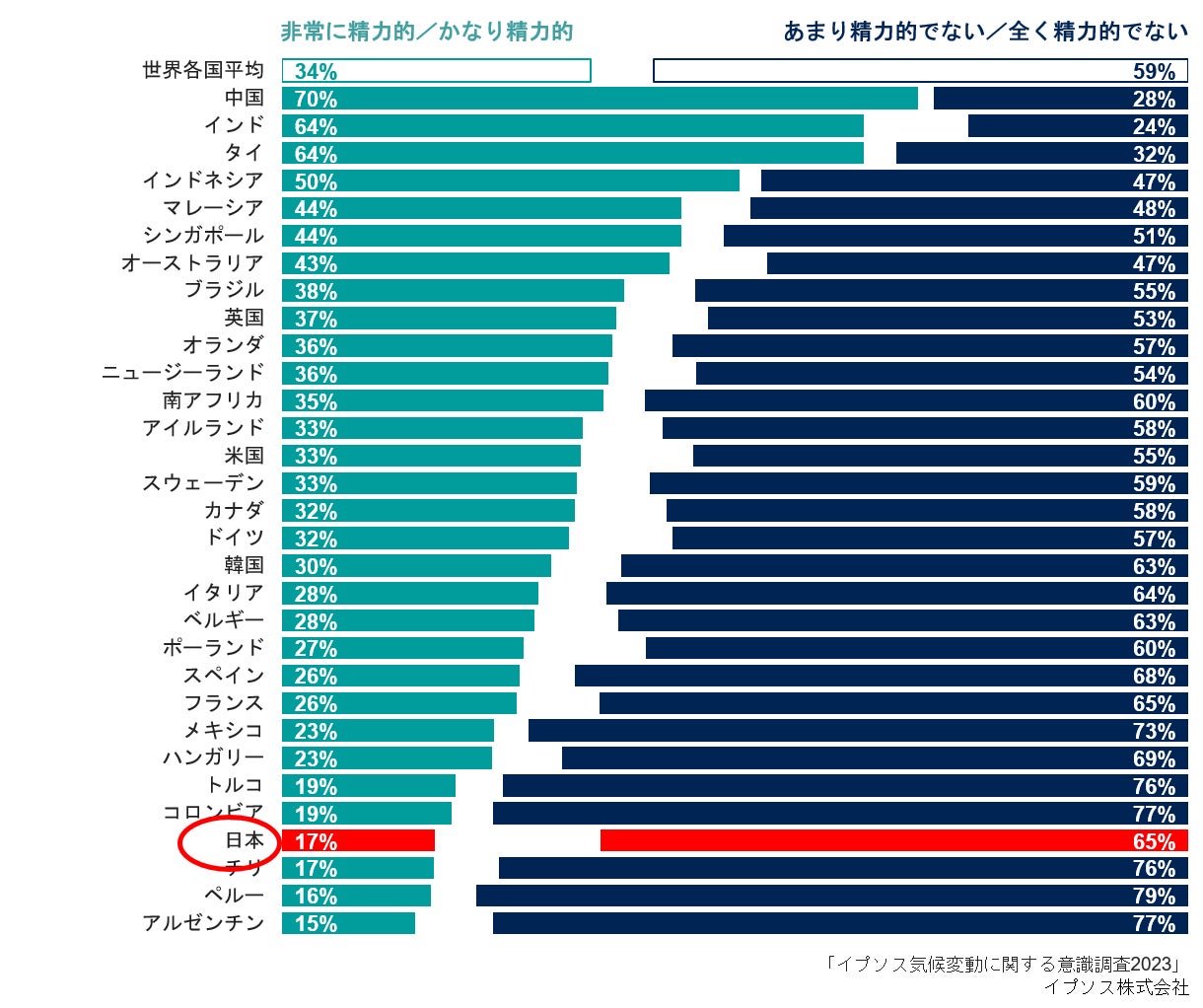 「国民は気候変動対策にどの程度精力的に貢献していると思いますか?」という設問に、「非常に精力的」「かなり精力的」と答えた日本人は、17%。31カ国中3番目に低い数字で、世界各国平均(34%)の1/2です。