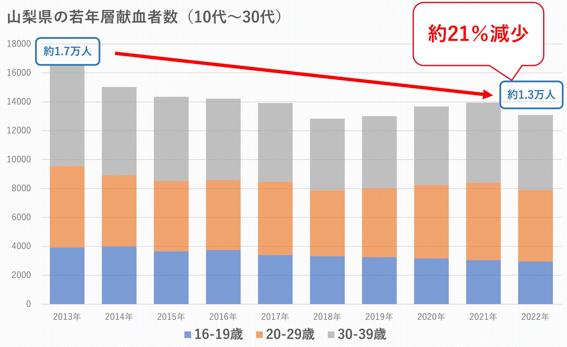 山梨県においては、高等学校での献血協力を積極的に実施してきましたが、約21%の減少が起こっています。