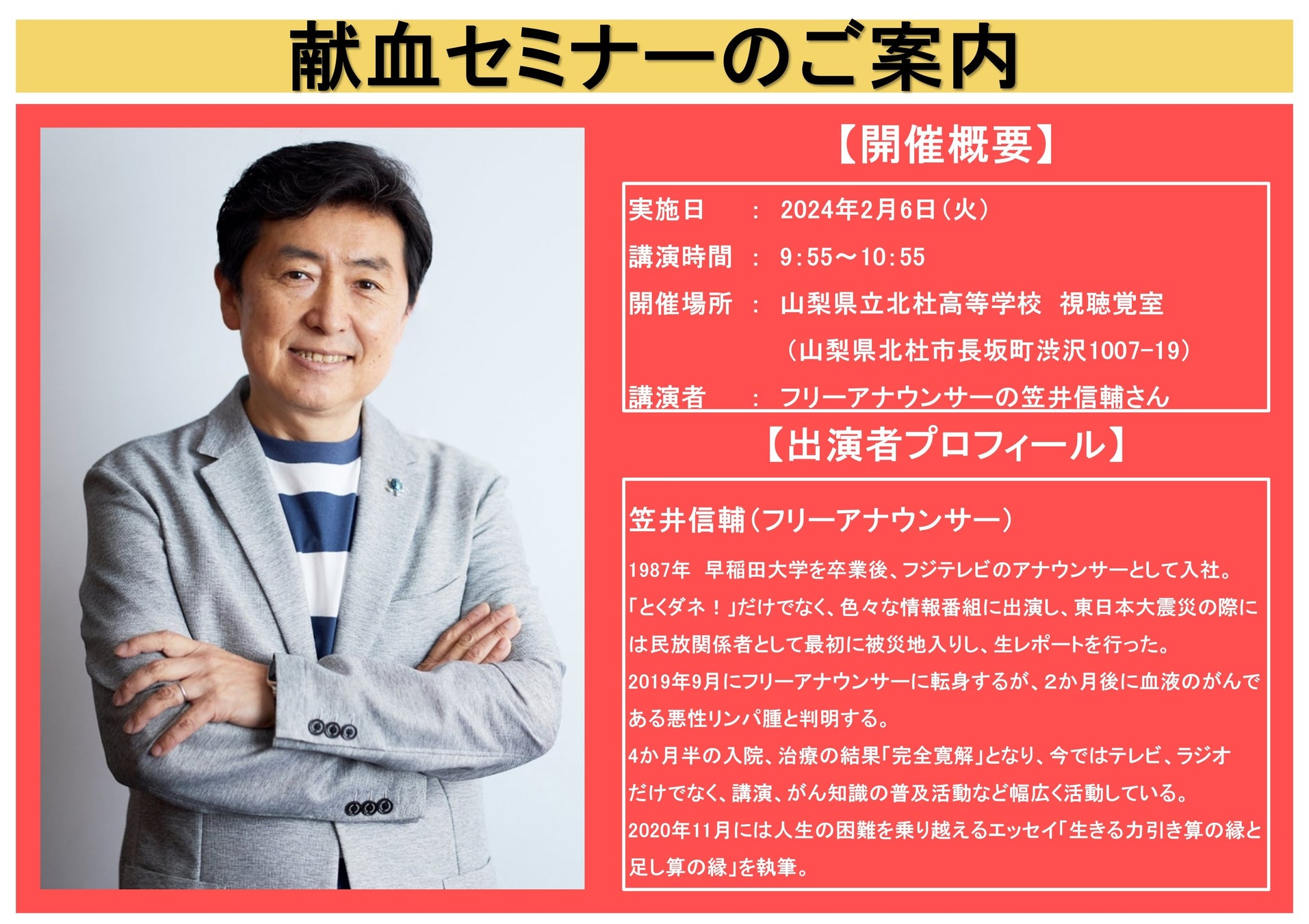 【気象状況を鑑み中止となりました】山梨県フリーアナウンサーの笠井信輔さんによる「献血セミナー」開催(中止)
