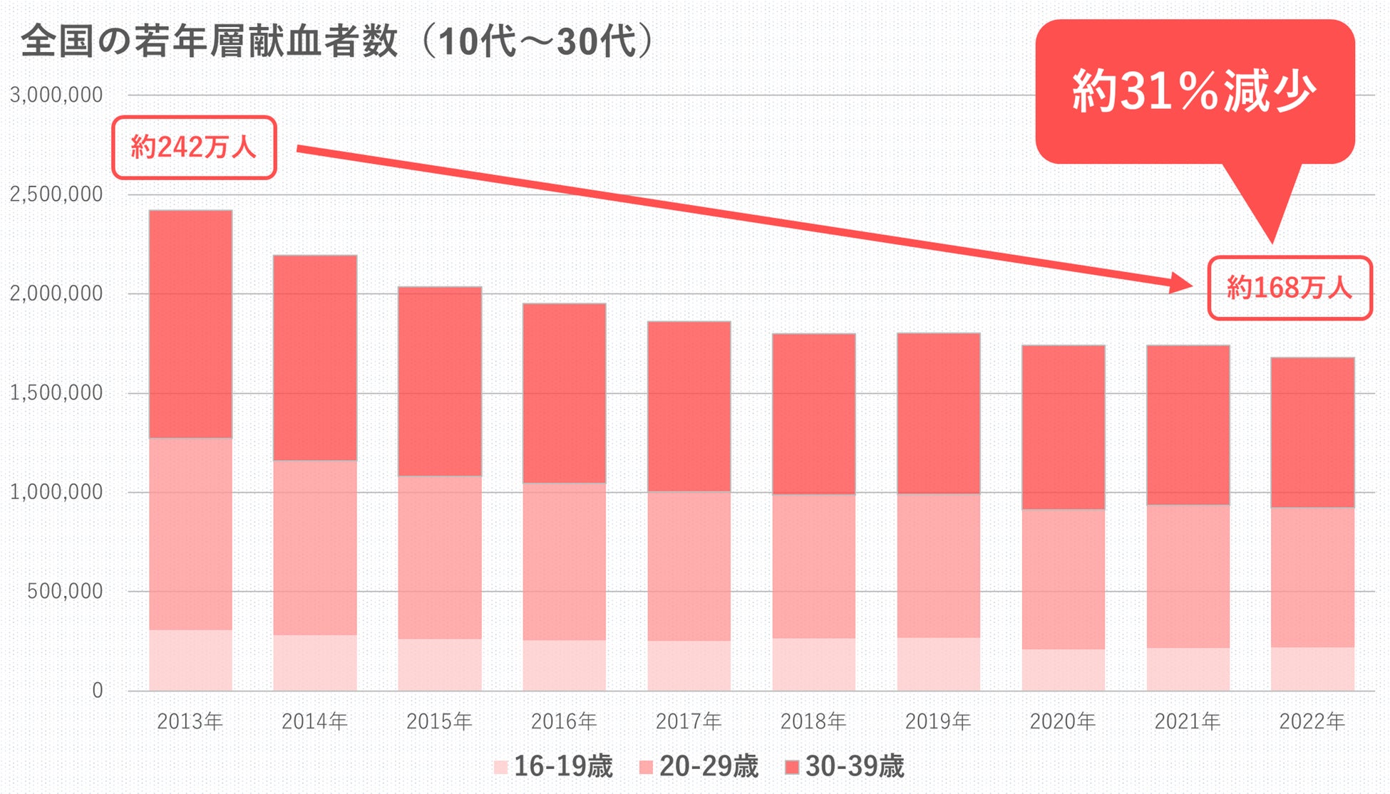 一方で、献血に協力いただいている方の約60%は50歳未満の方々であり、この世代の方々が輸血医療を大きく支えています。しかし、若年層(10~30代)の献血者数は減少傾向にあり、2013年と2022年を比較すると全国で約31%の献血者が減少しています。