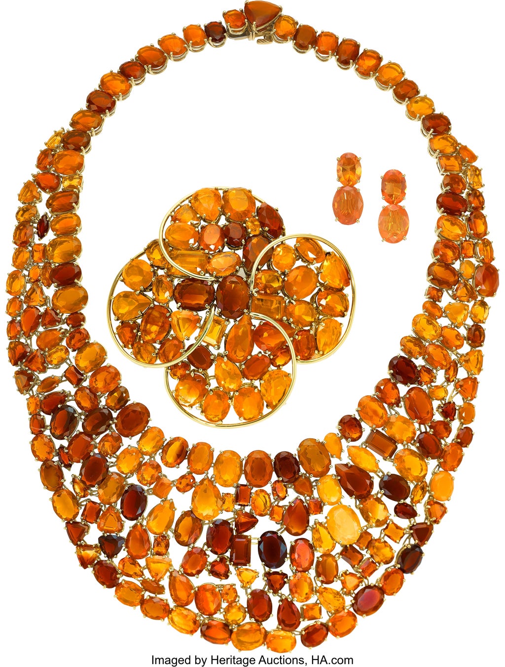 世界的に有名なアメリカ人アーティストであるトニー・デュケット氏がデザインした18Kゴールドで作られたネックレス、ブローチ、イヤリングのセットです。オレンジと赤の色合いの鮮やかなファイアオパールがさまざまな形やサイズで飾られています。