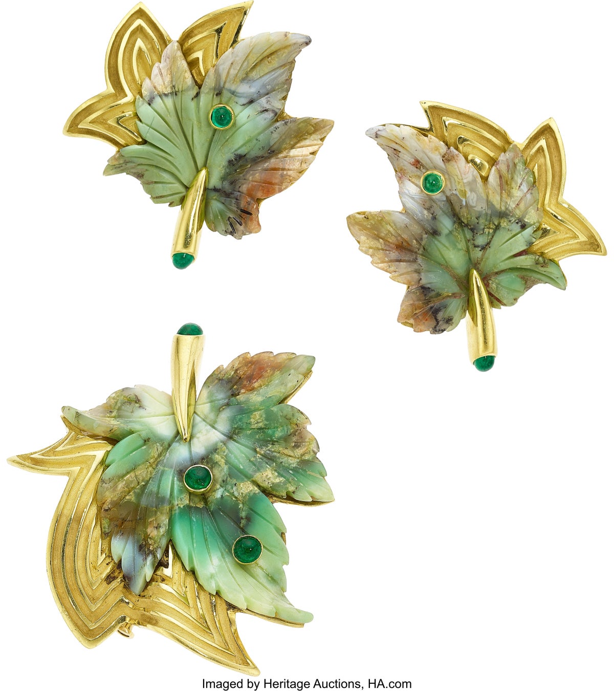 ニューヨークを拠点とするジュエリーデザイナーのクリストファー・ウォーリング氏の作品も出品されています。このイヤリングとブローチに彫刻されたクリソプレーズのカエデの葉は、秋と紅葉の色を表現しています。裏側には、クリストファー・ウォーリング氏のC. Wallingの刻印があります。