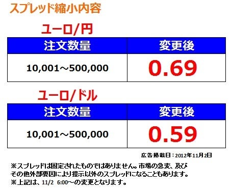 SBI FXトレードが提供する外国為替証拠金取引「SBI FXTRADE」は、本日(11月2日)、米ドル/円のスプレッド縮小を行ったばかりですが、来週11月5日(月)午前7時より、ユーロ/円、ユーロ/ドルのスプレッドも縮小を実施することを決定いたしました。