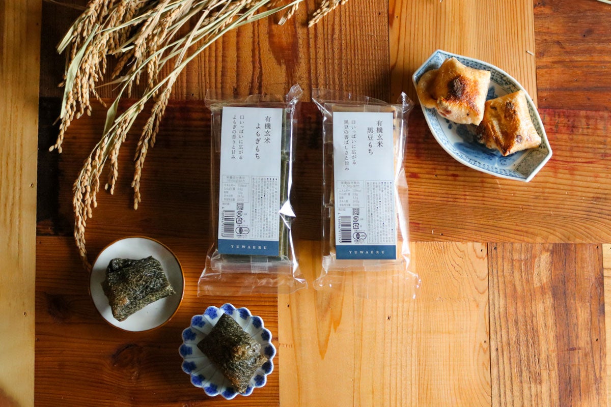 - 有機栽培玄米で作った香ばしい「有機玄米黒豆もち」と「有機玄米よもぎもち」