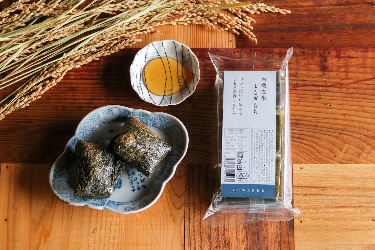 国産有機栽培もち米100%の玄米もちに、香りの良い国産のよもぎ粉を混ぜ有機玄米よもぎもちです。