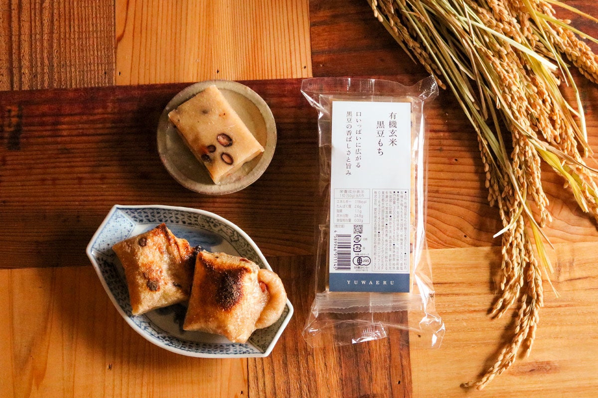 国産有機栽培もち米100%の玄米もちに、厳選した青森産の有機黒豆を混ぜることで更に香ばしく仕上げました。