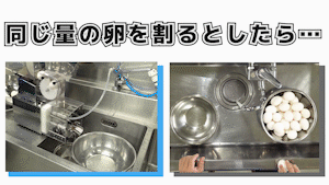 スピードは手作業の3倍以上(6秒に1個、手作業では普通20秒)、手作業でも難しいとろとろ半熟卵をロス率5%以下(手作業では普通ロス率20%)で素早く丁寧に剥くことが出来ます。