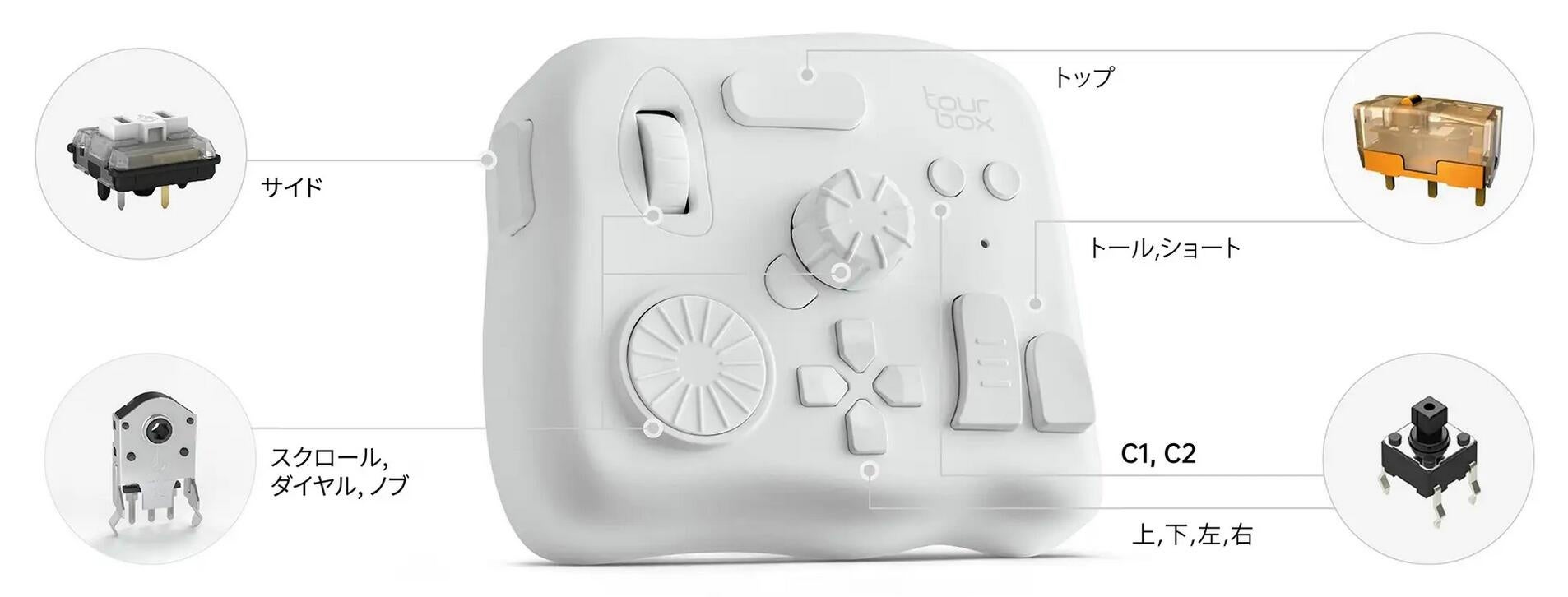 『TourBox Elite』の各ボタンには、役割に応じた4タイプのスイッチエンコーダーが採用されています。各ボタンによってクリックした感触が異なるように改良してあり、これまでに無いユーザー体験を実現しています。