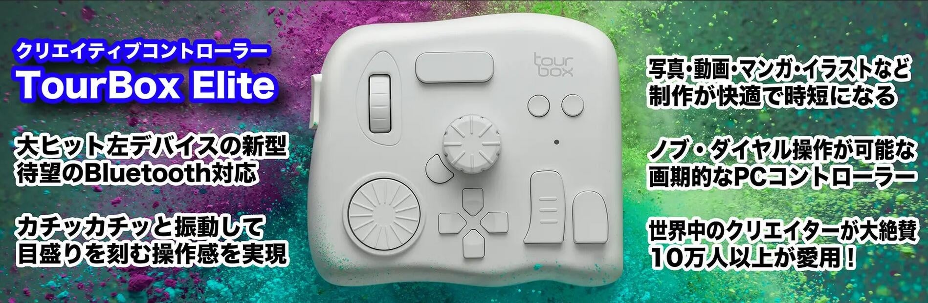 左手デバイスとして、全世界10万人以上のクリエイターが絶賛する『TourBox』シリーズ。最新型の『TourBox Elite』は、クリエイター待望のBluetooth対応となり、PCやMacと無線接続で利用できるようになりました。従来の使用感はそのままに、Bluetoothを活かした機能や、先進の広帯域振動モーター内蔵した操作感を実現し、さらにパワーアップした製品となっております。