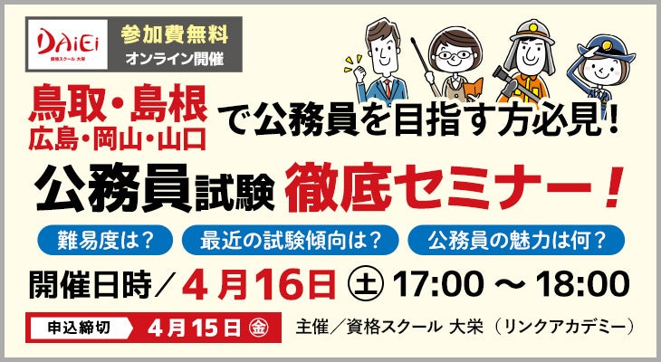【4月16日無料セミナー開催】鳥取・島根・広島・岡山・山口で公務員を目指す方に朗報!地域特化の公務員試験徹底解説セミナーを資格スクール大栄が開催します