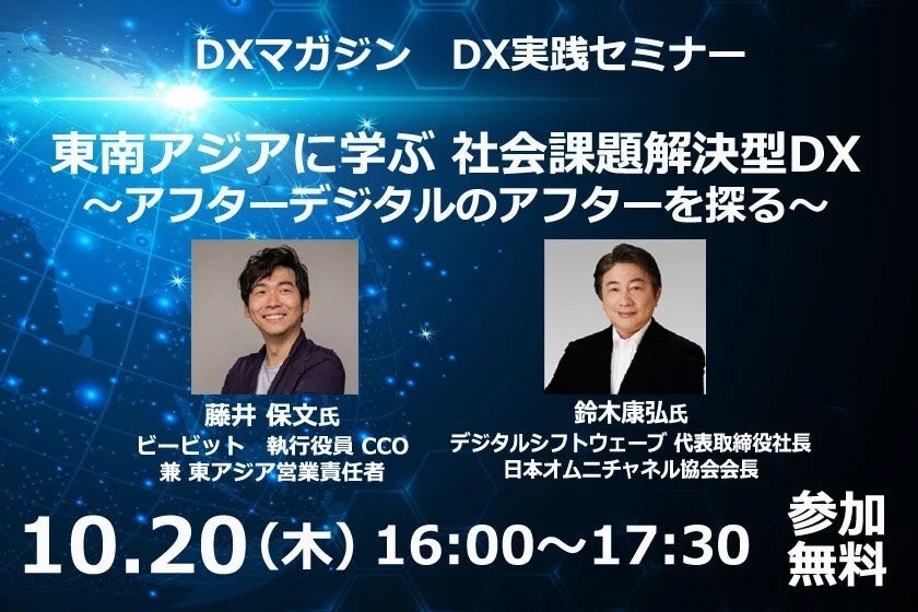 DXマガジンは2022年10月20日、定例のDX実践セミナーを開催します。今回のテーマは「東南アジアに学ぶ 社会課題解決型DX~アフターデジタルのアフターを探る~」。ゲストにビービット 執行役員 CCO 兼 東アジア営業責任者の藤井保文氏を招き、東南アジアのDXの動きを紹介します。藤井氏の著書である「アフターデジタル」をもとに、デジタル化した社会で求められる企業の姿勢やビジョンも考察します。