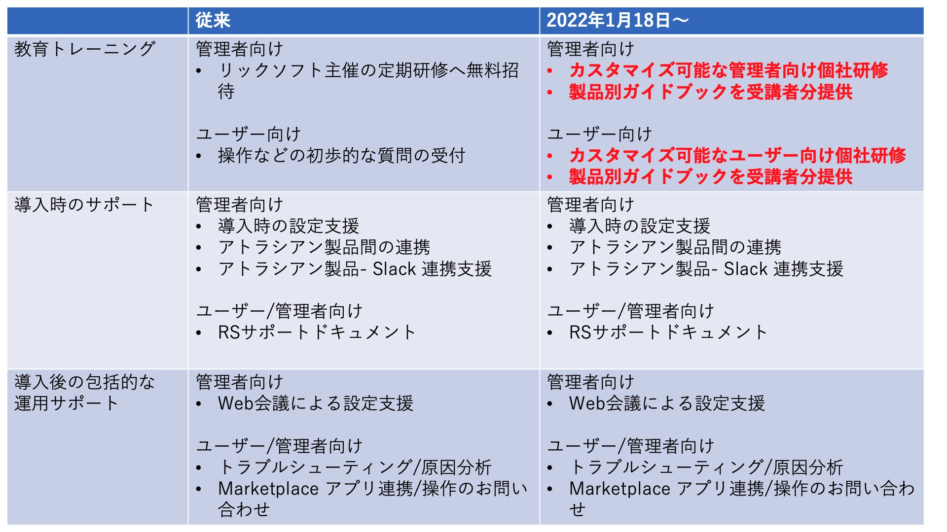 アトラシアン製品のクラウド版を利用するお客さまの運用をサポートする「サポートプラス」を発売して1年がたちました。そこで、さらにお客さまのご希望に添ったサポートを提供できないかと考え、この度従来の特典であった定期研修をセミオーダー型の個社研修へとグレードアップします。