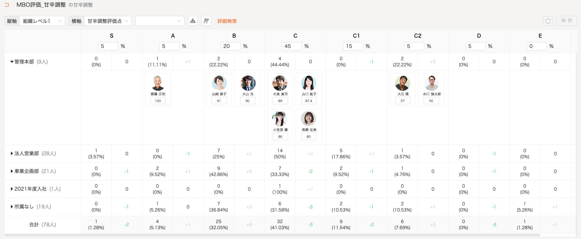 縦軸の選択は最大2つまで可能で、なおかつ選択種類も豊富です。例えば、部署、評価者、職種などの選択ができ、多方面で評価分布を確認や分析、より社内の基準に適した調整が可能になります。