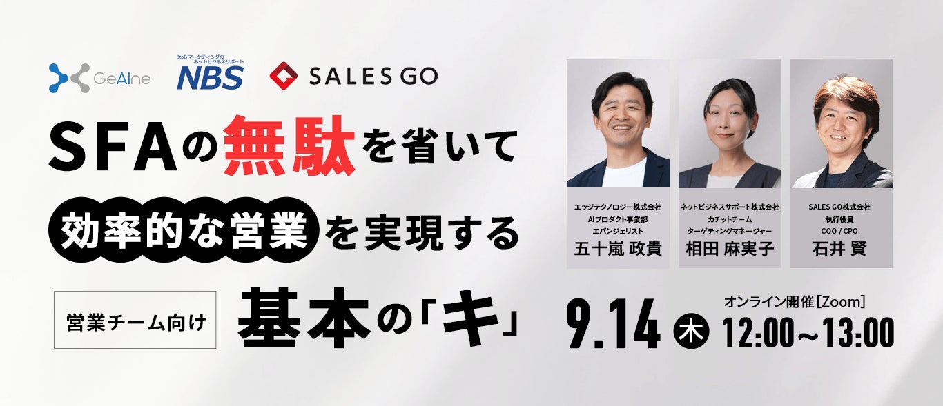 エッジテクノロジー株式会社(所在地:東京都千代田区、代表取締役:住本 幸士)のAIプロダクト事業部 エヴァンジェリスト 五十嵐 政貴氏と、ネットビジネスサポート株式会社(所在地:東京都渋谷区、代表取締役社長:池上 正夫)のカチットチーム ターゲティングマネージャー 相田 麻実子氏とともに、SFAの「無駄」を省いて効率よく営業をするコツについてディスカッション形式でご紹介いたします。