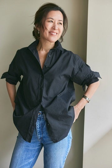 「シャツは、袖のまくり方や襟元の開け方や抜き方など、ちょっとだけ着るコツが必要なことが多いのですが、フィナモレのシャツは、着るだけでなんだかかっこよく見えるんです。たとえば襟の芯が女性の首のカーブに合うように設計されているから凜と立ち上がるし、ボタン位置が計算されているからちょうどよい開き具合になる。