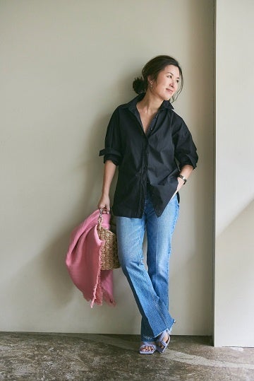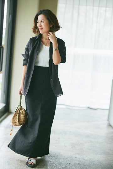 今回は黒のマキシ丈スカートと合わせ、中に白のタンクトップをプラスした、カジュアルなモノトーンのコーディネート。カリフォルニアの太陽の下で着ているようなイメージです。前を開けて着ることで、黒の分量が調整されて、ほんのり透け感のある黒のコットンなので、軽やかに見せてくれます」