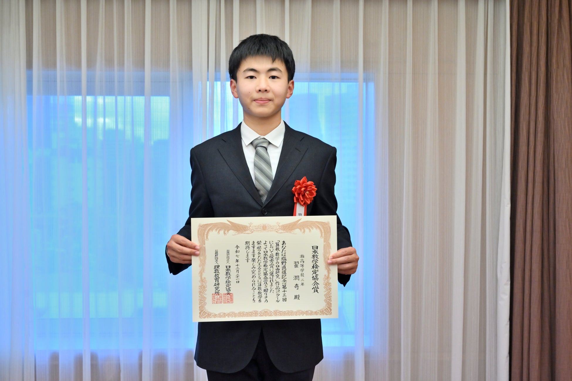 算数・数学の実用的な技能を測る、実用数学技能検定「数検」(数学検定・算数検定、以下「数検」)を実施・運営している公益財団法人日本数学検定協会(所在地:東京都台東区、理事長:髙田 忍、以下「当協会」)は、公益財団法人理数教育研究所が主催している「塩野直道記念 第13回『算数・数学の自由研究』作品コンクール」(通称「MATH(マス)コン」)の優秀賞の1つである「日本数学検定協会賞」を決定し、2025年12月21日(日)に東京都内で行われた表彰式で受賞者を表彰いたしました。