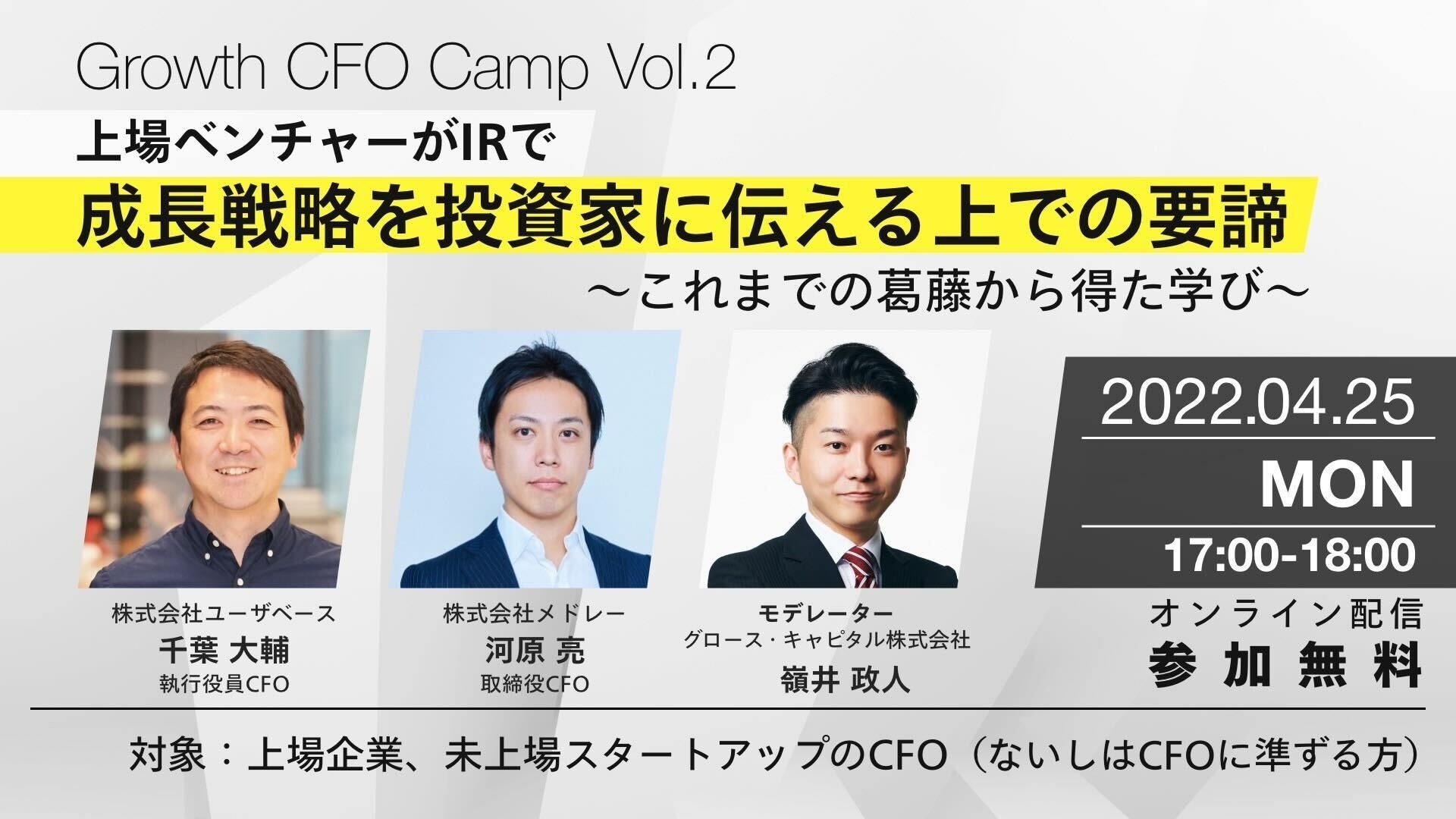 上場ベンチャーが成長し続ける上で投資家との対話は不可欠であり、4月4日に控える東証再編では、グロース市場へ上場する企業に対して「事業計画及び成長可能性に関する事項」の年1回以上の開示が義務化されます。そのような環境において、上場ベンチャーはCFOを中心に中長期的な視点を踏まえた質の高いコミュニケーションを通じて、投資家へ成長戦略を伝えていくことがより求められます。