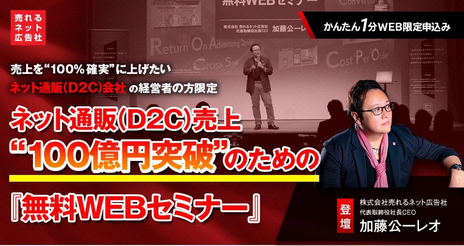 「ネット通販(D2C)」×「広告」に特化したクラウドサービスおよびコンサルティングサービスを提供する売れるネット広告社(代表取締役社長 CEO:加藤公一レオ、本社:福岡県福岡市)は、ネット通販(D2C)会社の経営者限定の無料WEBセミナーを毎週開催致します。