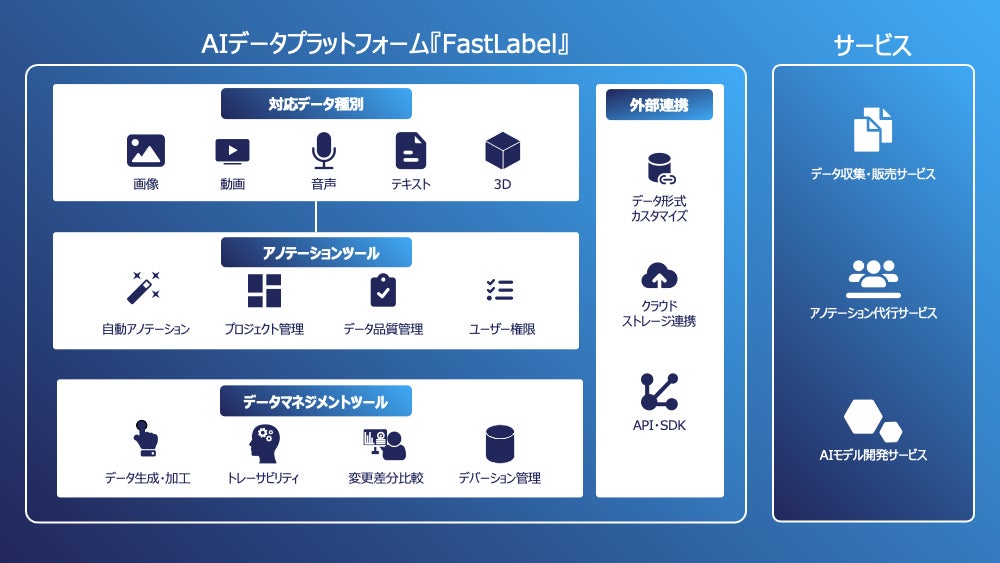 AIデータプラットフォーム「FastLabel」は、教師データ作成の自動化機能や品質管理、プロジェクト管理、モデルの学習/評価機能を有したSaaS型システムと、教師データ作成代行やデータコンサルティング、モデル開発等のサービスを包括した統合型のプラットフォームです。
