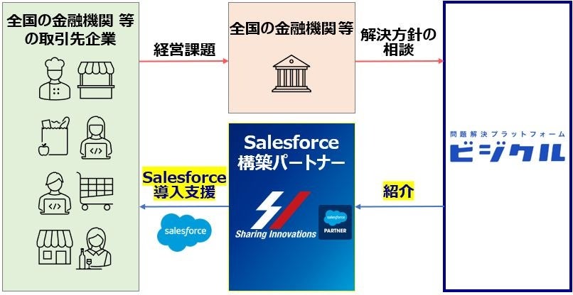 株式会社Sharing Innovations(東京都渋谷区、代表取締役社長:飯田 啓之、以下Sharing Innovations)は、株式会社BusinessTech(本社:東京都千代田区、代表取締役:三浦 一大、以下:BusinessTech)と業務提携を行い、BusinessTechが運営する問題解決プラットフォーム「ビジクル」を利用する金融機関等を通じて、中堅中小企業に向けたSalesforce導入支援サービスを提供いたします。
