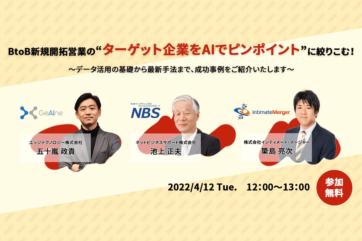 また、本サービスの提供開始を記念して無料Webセミナー「BtoB新規開拓営業のターゲット企業をAI活用でピンポイントに絞りこむ!」を4月12日(火)12時00分より開催します。