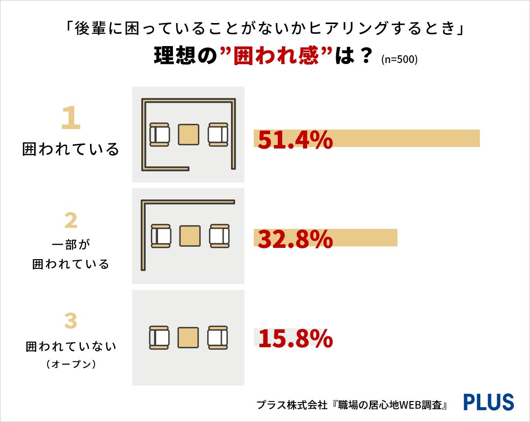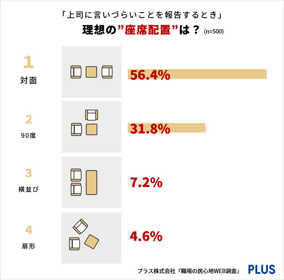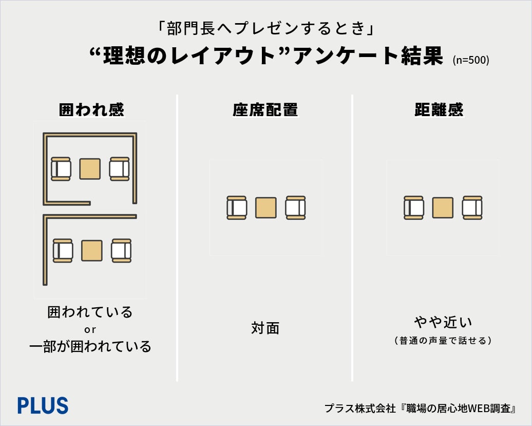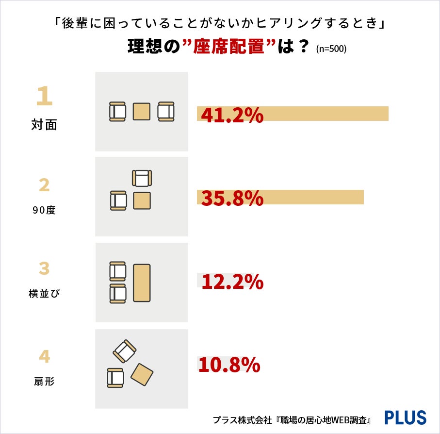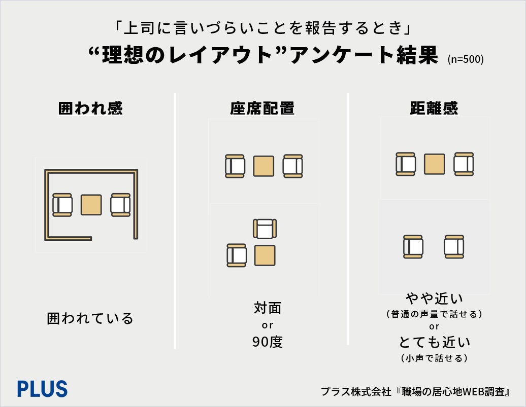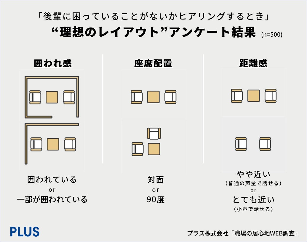 シチュエーション別の理想のレイアウトを尋ねると、「上司へ言いづらいことを報告」する場面では”囲われ感”が重視され、「後輩に困りごとをヒアリング」する場面では他と比較して”90度”の座席配置に票が集まるなど、状況によって理想的なレイアウトは異なることがわかる結果となりました。