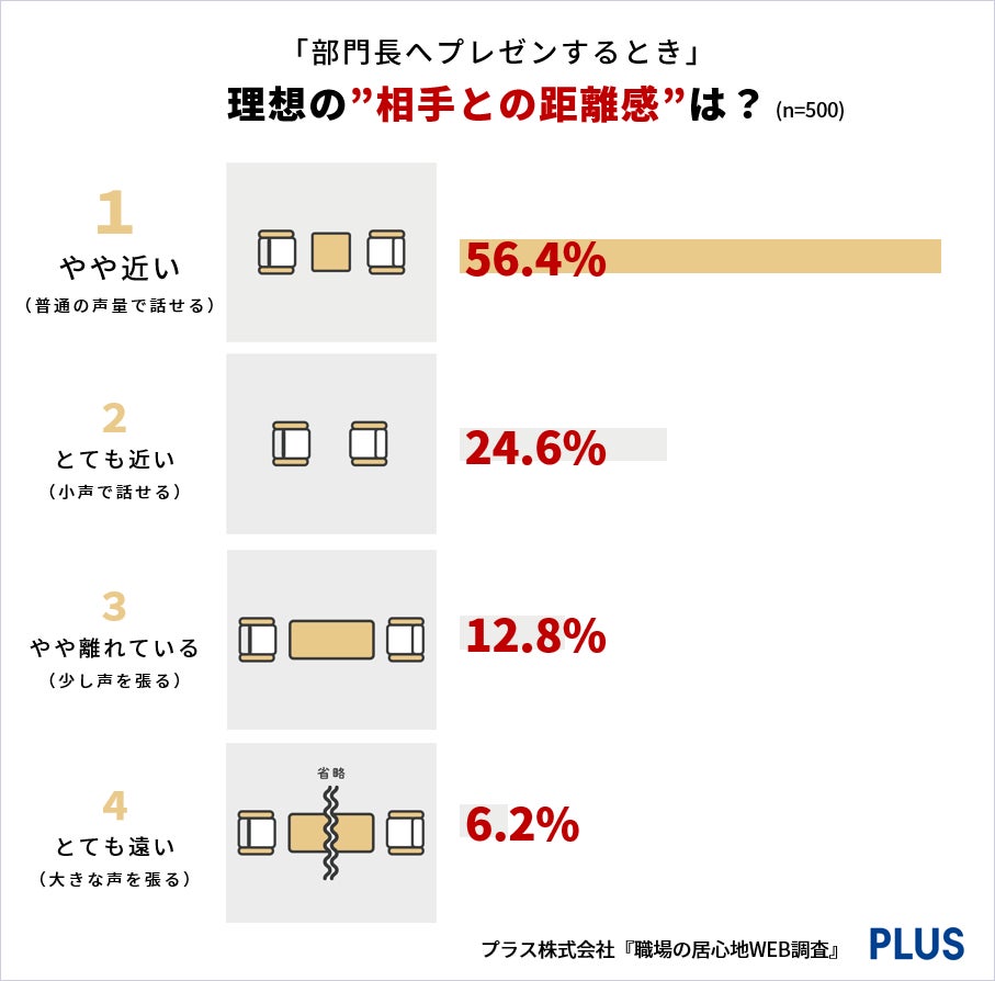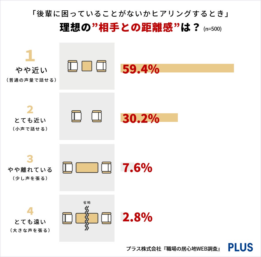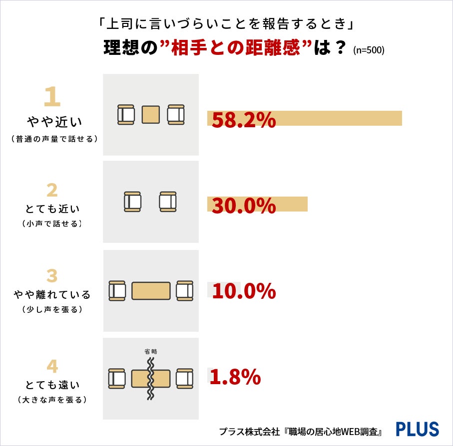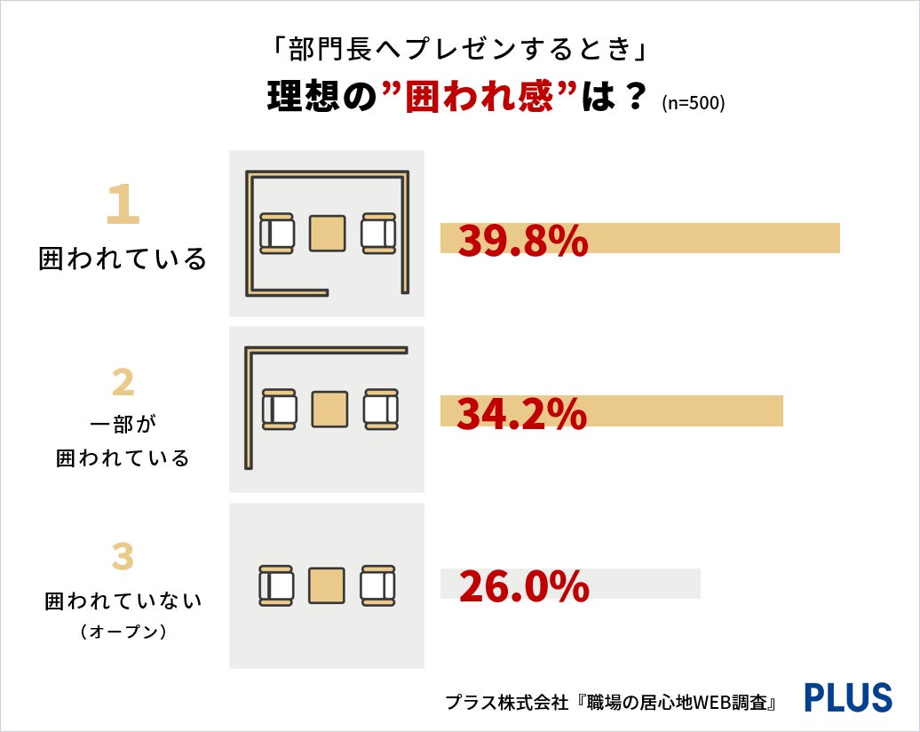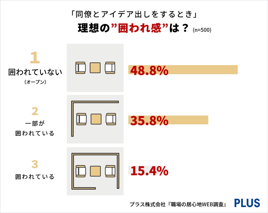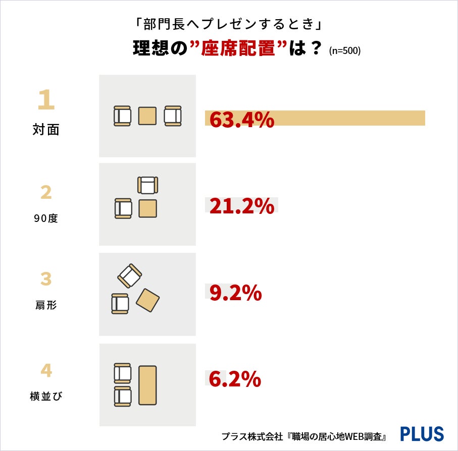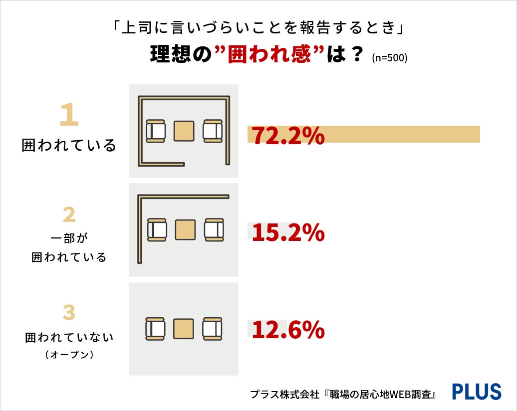シチュエーション別の理想のレイアウトを尋ねると、「上司へ言いづらいことを報告」する場面では”囲われ感”が重視され、「後輩に困りごとをヒアリング」する場面では他と比較して”90度”の座席配置に票が集まるなど、状況によって理想的なレイアウトは異なることがわかる結果となりました。