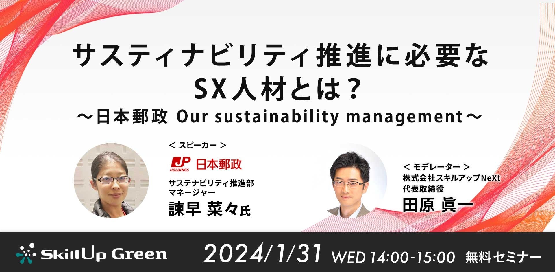 株式会社スキルアップNeXt(以下スキルアップNeXt、東京都千代田区神田三崎町3丁目3-20、代表取締役 田原 眞一、旧社名 スキルアップAI株式会社)は、2024年1月31日14:00-15:00に、日本郵政株式会社 サステナビリティ推進部 マネージャー 諫早 菜々 氏をゲストに迎え、オンラインセミナー「サスティナビリティ推進に必要なSX人材とは? ~ 日本郵政グループ Our sustainability management ~」を開催します。お申込みは次のURLより受け付けています。