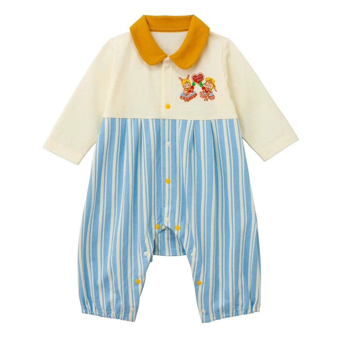 ストライプ柄は、にんじん畑のうさぎがワンポイントで、ブルーやイエローを基調としており、男の子にも女の子にも似合うデザインです。