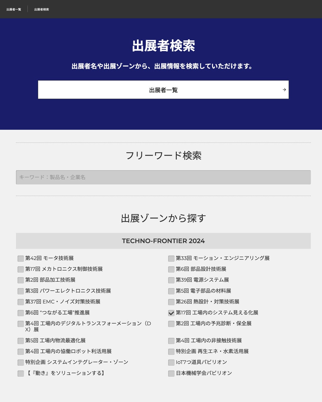 出展者検索のページでは、「出展者一覧」「フリーワード検索」「出展ゾーンから探す」の、