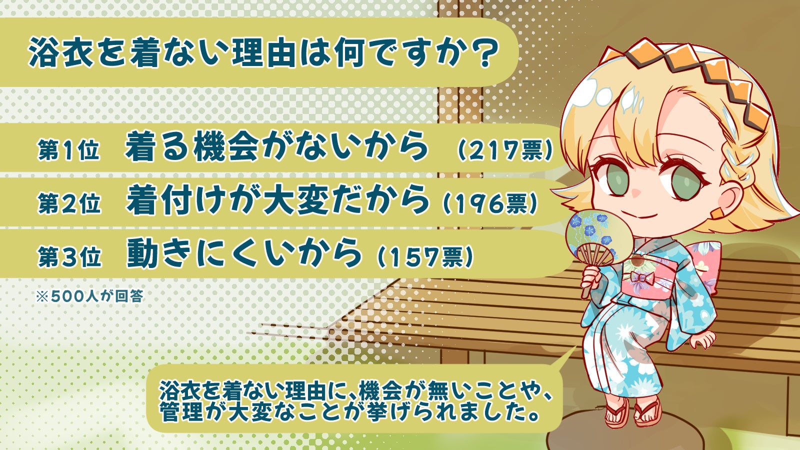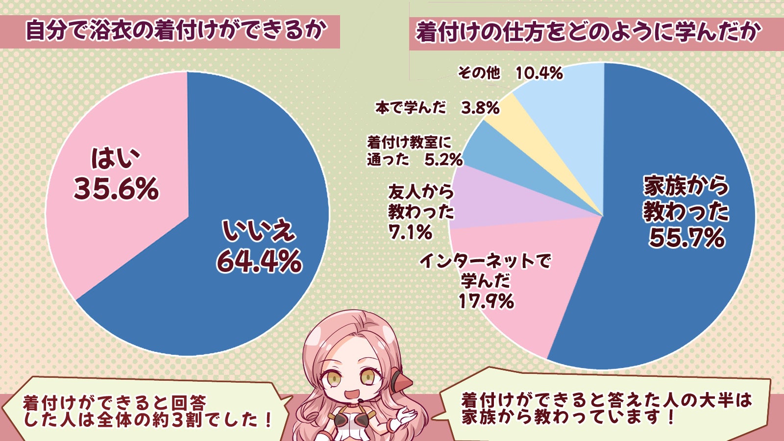 アンケートの結果、自分で浴衣の着付けができると答えた人は35.6%と明らかになりました。