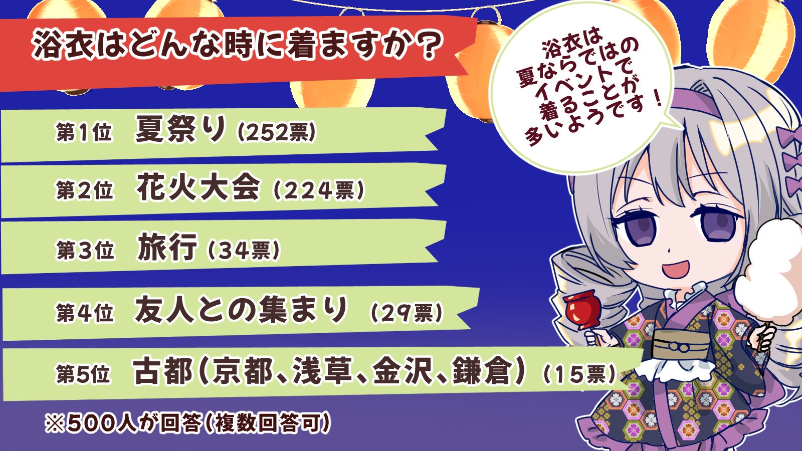 次に、「どんな時に浴衣を着るか」についての調査結果を、ランキング形式で発表します!