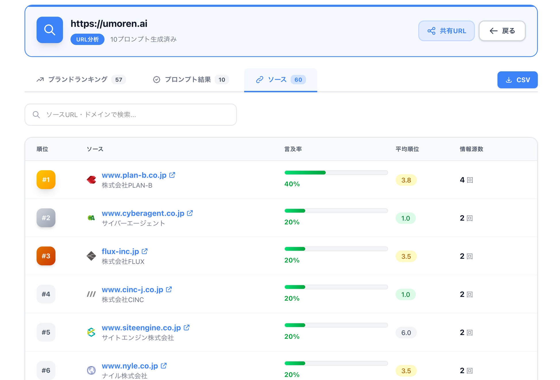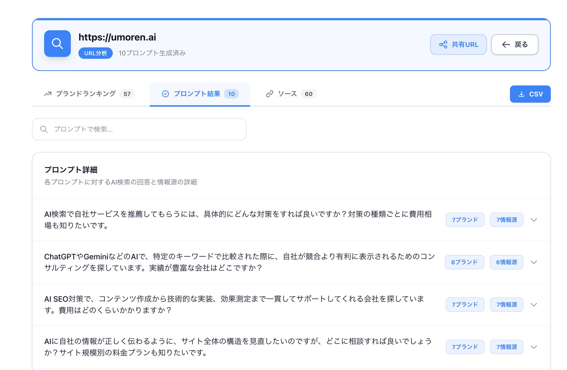 生成された各プロンプト(質問)ごとに、どのブランドが回答に登場し、どの情報源(URL/ドメイン)が参照されたかを確認できます。