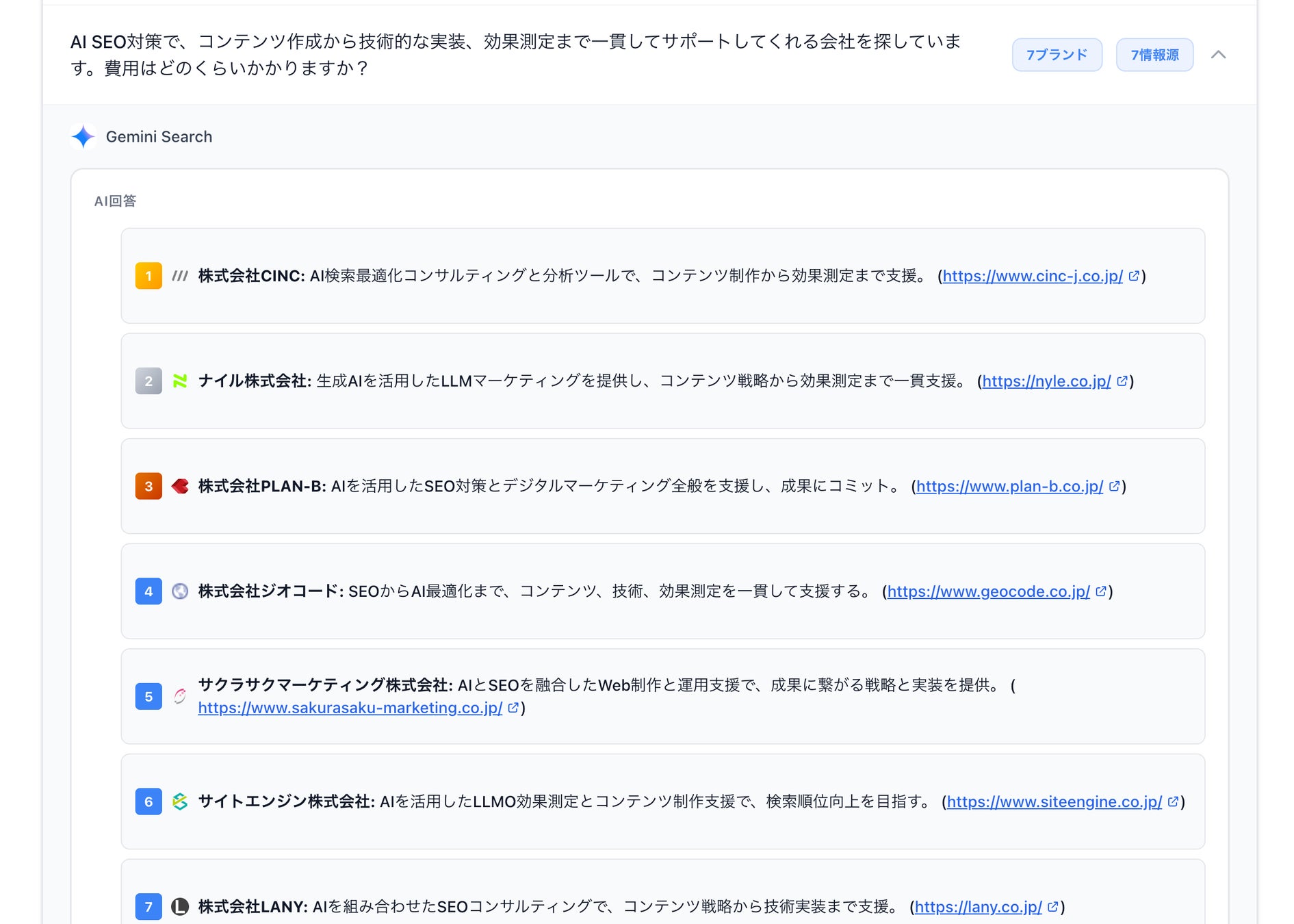 AI検索実行:生成したプロンプトでGemini Searchを実行し、どのブランドが引用・推薦されたか、どの情報源が参照されたかを記録