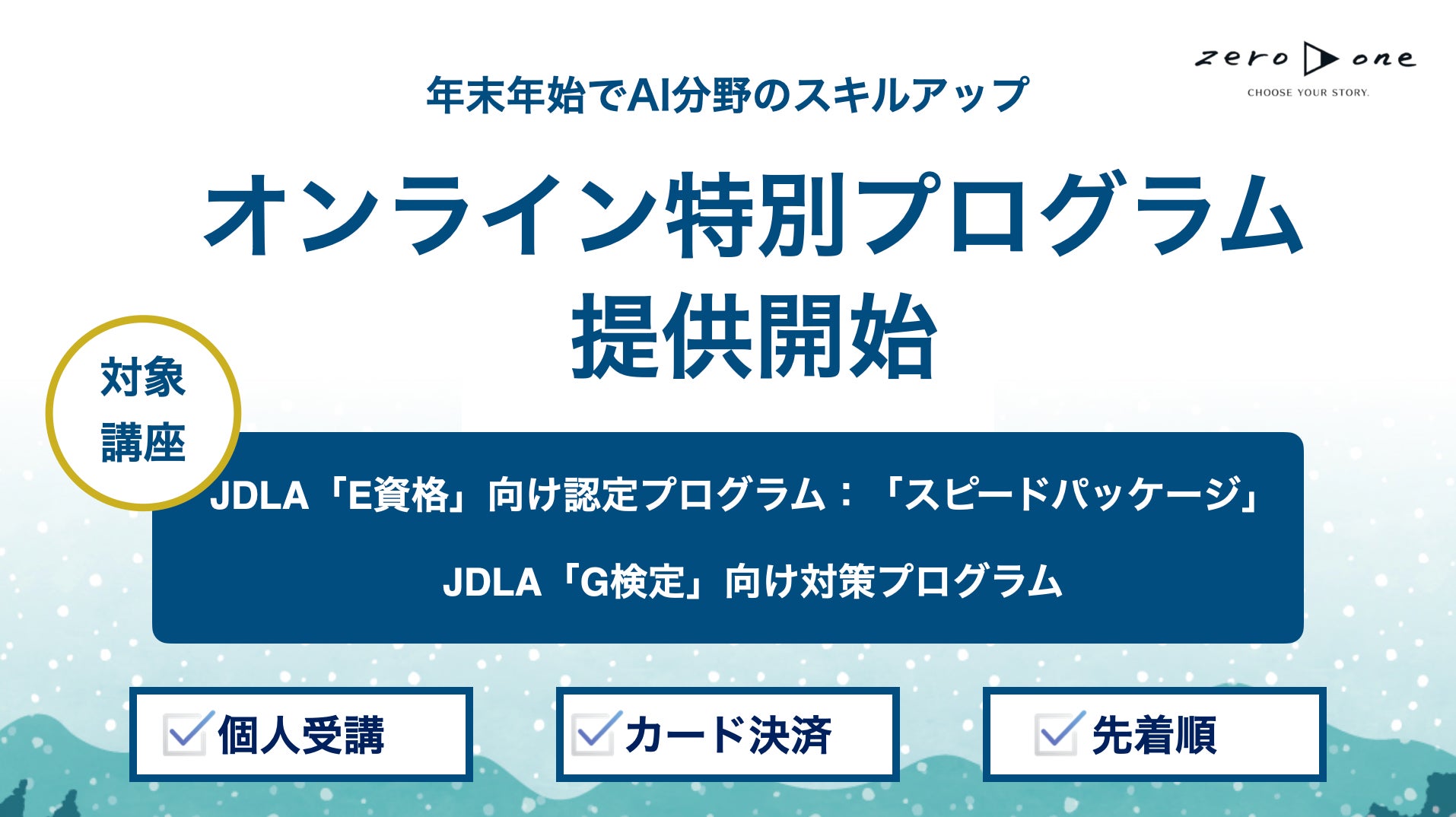 zero to one、年末年始を活用したAI分野のスキルアップを支援、JDLA「E資格」「G検定」向けオンライン特別プログラムを提供を開始
