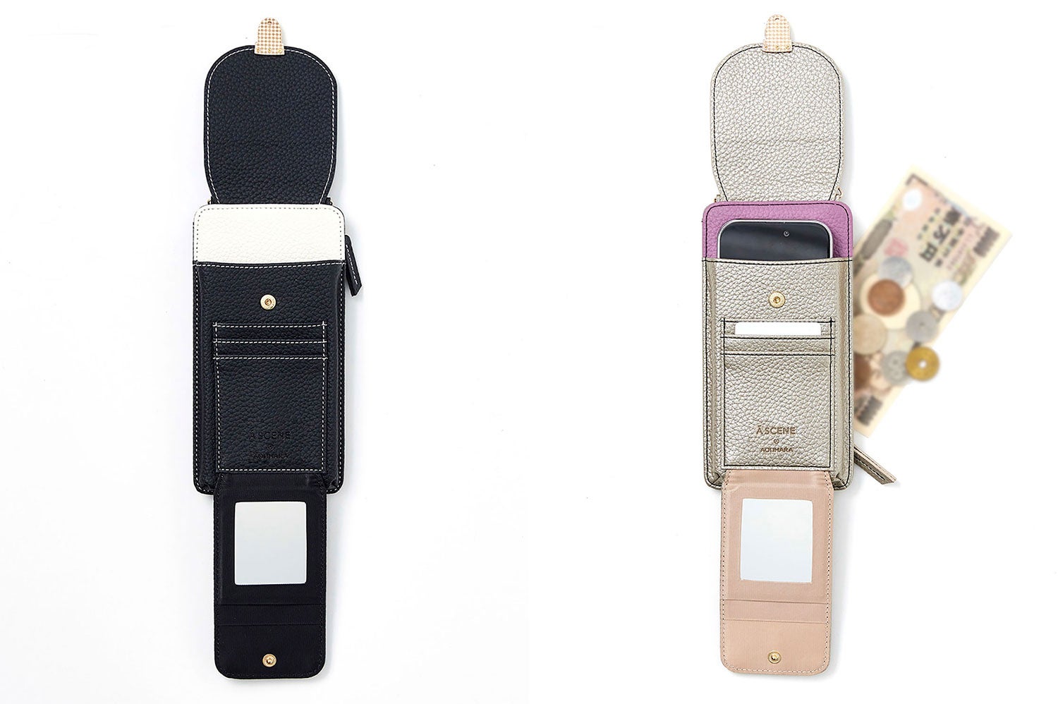 AOI. ミラー・ウォレット・カードケースをドッキングして1stモデル同様にファッション性、機能性を充実させたところです。