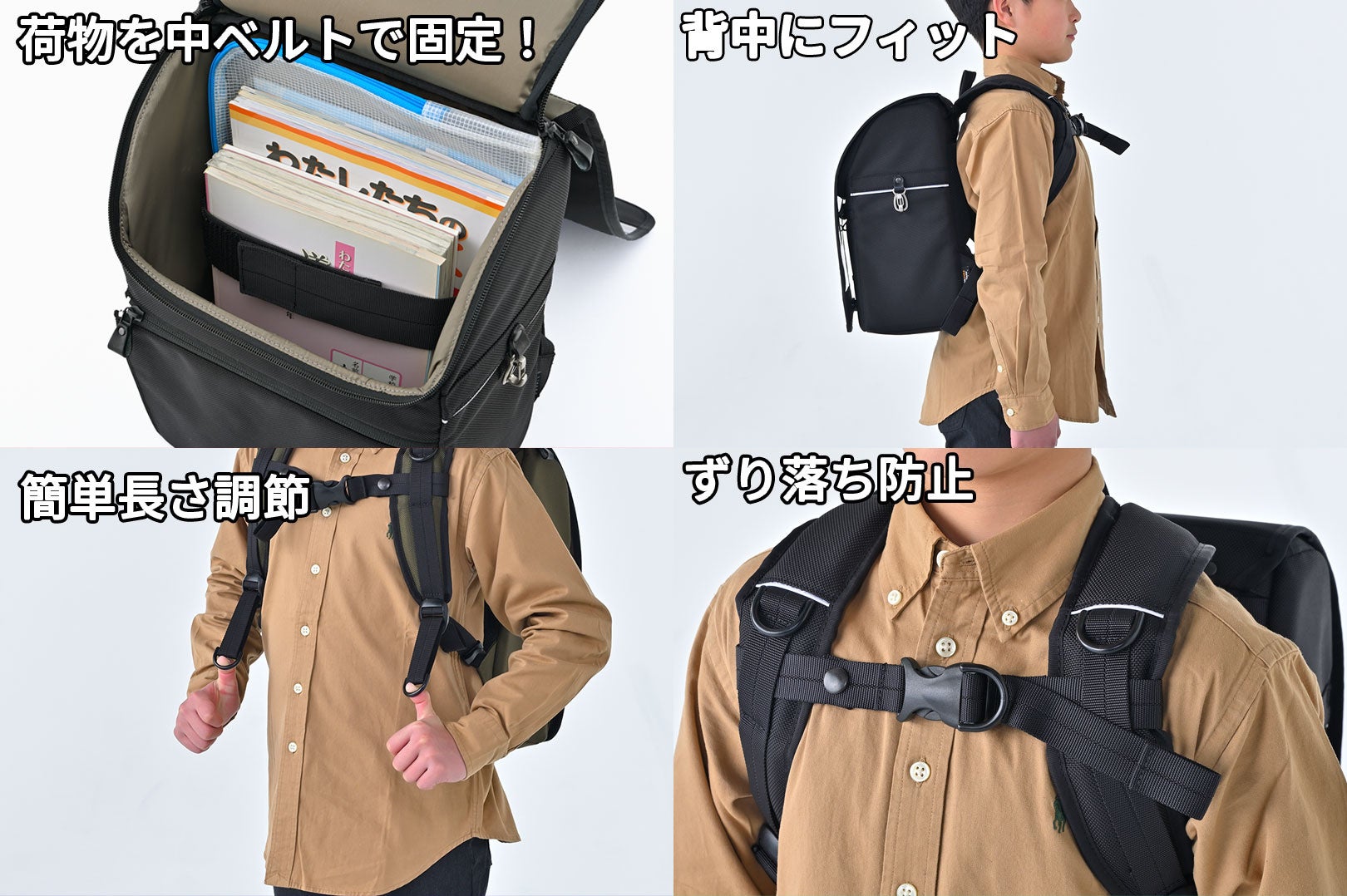 体にしっかりと密着していると、同じ重さのバッグでも軽く感じられます。