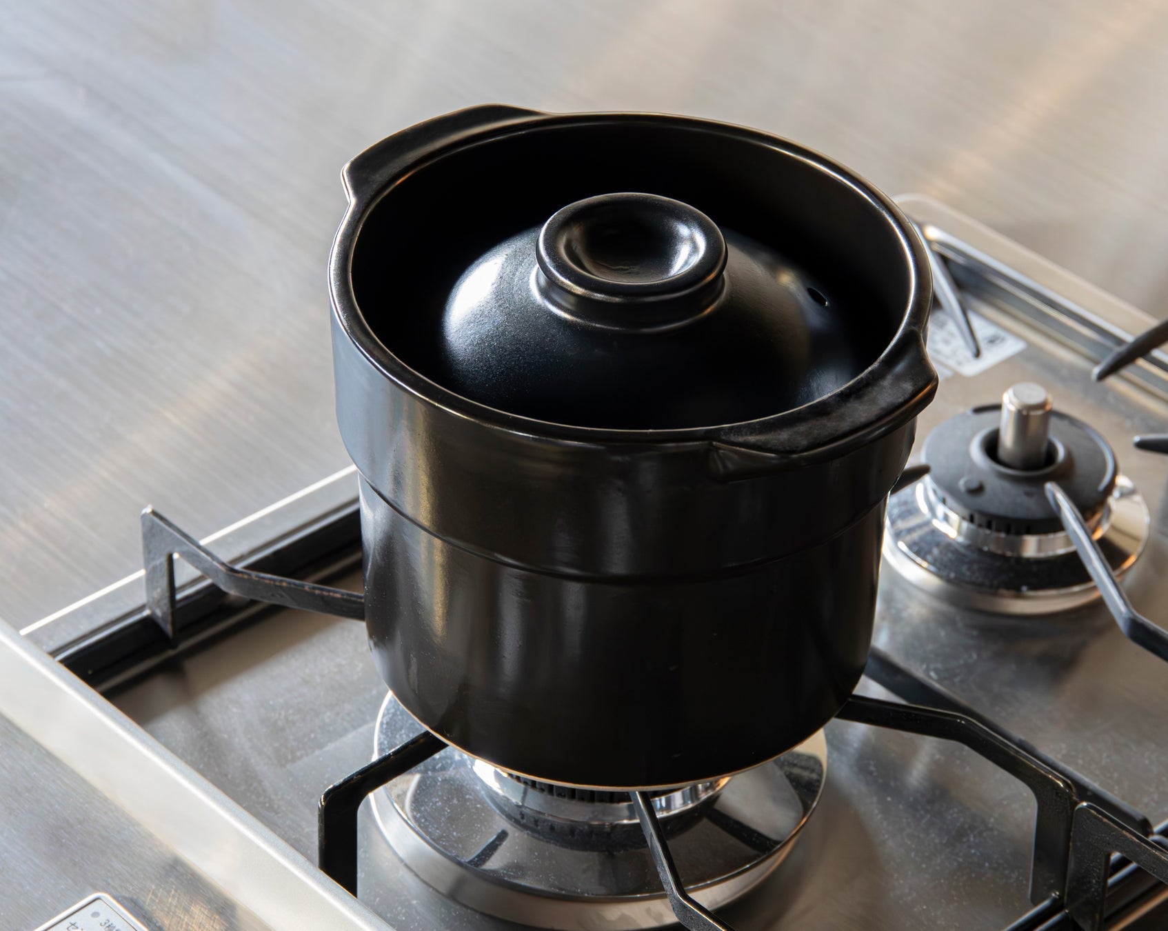 『電子レンジ調理土鍋TETTORI(テットリ)』は「炊く」「煮る」「蒸す」料理ができる1台3役のちいさな土鍋です。またこの土鍋は電子レンジと直火がどちらも使え、その日の気分や忙しさで使い分けることができます。サイズは1人暮らしやちょこっと使いにちょうどいい小鍋サイズで、ご飯なら1合炊きです。土鍋は深めの設計で炊飯時の吹きこぼれがしづらく、料理では材料がたっぷり入る容量です。