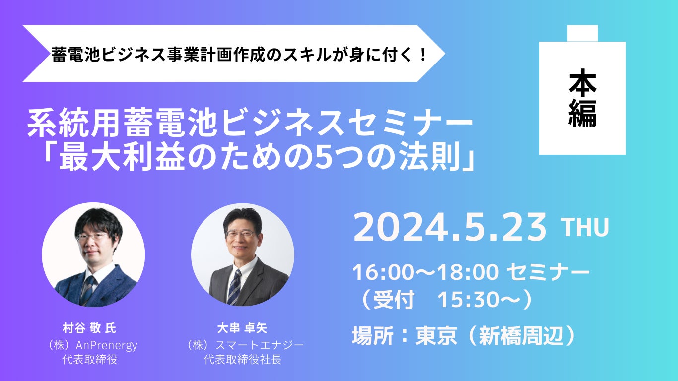 太陽光発電所の運営・保守事業において国内最大手(※)の株式会社スマートエナジー(東京都港区 代表取締役 大串卓矢、以下スマートエナジー)は、株式会社AnPrenergy(東京都港区 代表取締役 村谷 敬、以下AnPrenergy)との共催で、『系統用蓄電池ビジネスセミナー 「最大利益のための5つの法則」』を開催します。