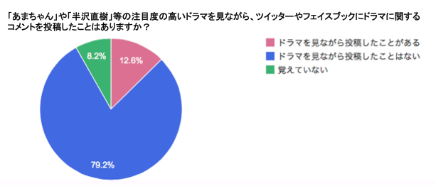 ◆ 「あまちゃん」や「半沢直樹」等の注目度の高いドラマを見ながら、ツイッターやフェイスブックにドラマに関するコメントを投稿したことがあるか質問したところ、「ある」は12.6%となりました。「ない」は79.2%、「覚えていない」は8.2%となりました。