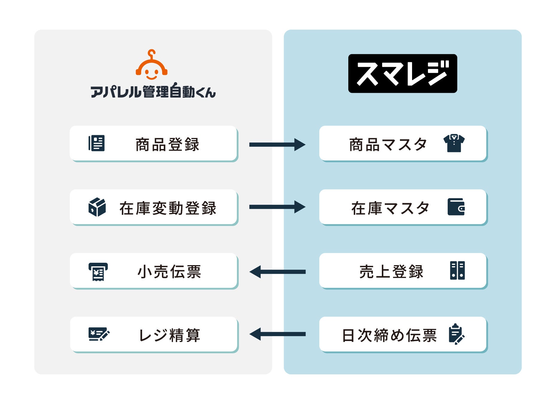 「アパレル管理自動くん」×「スマレジ」とのAPI連携によって、以下3つの情報連携が可能になります。