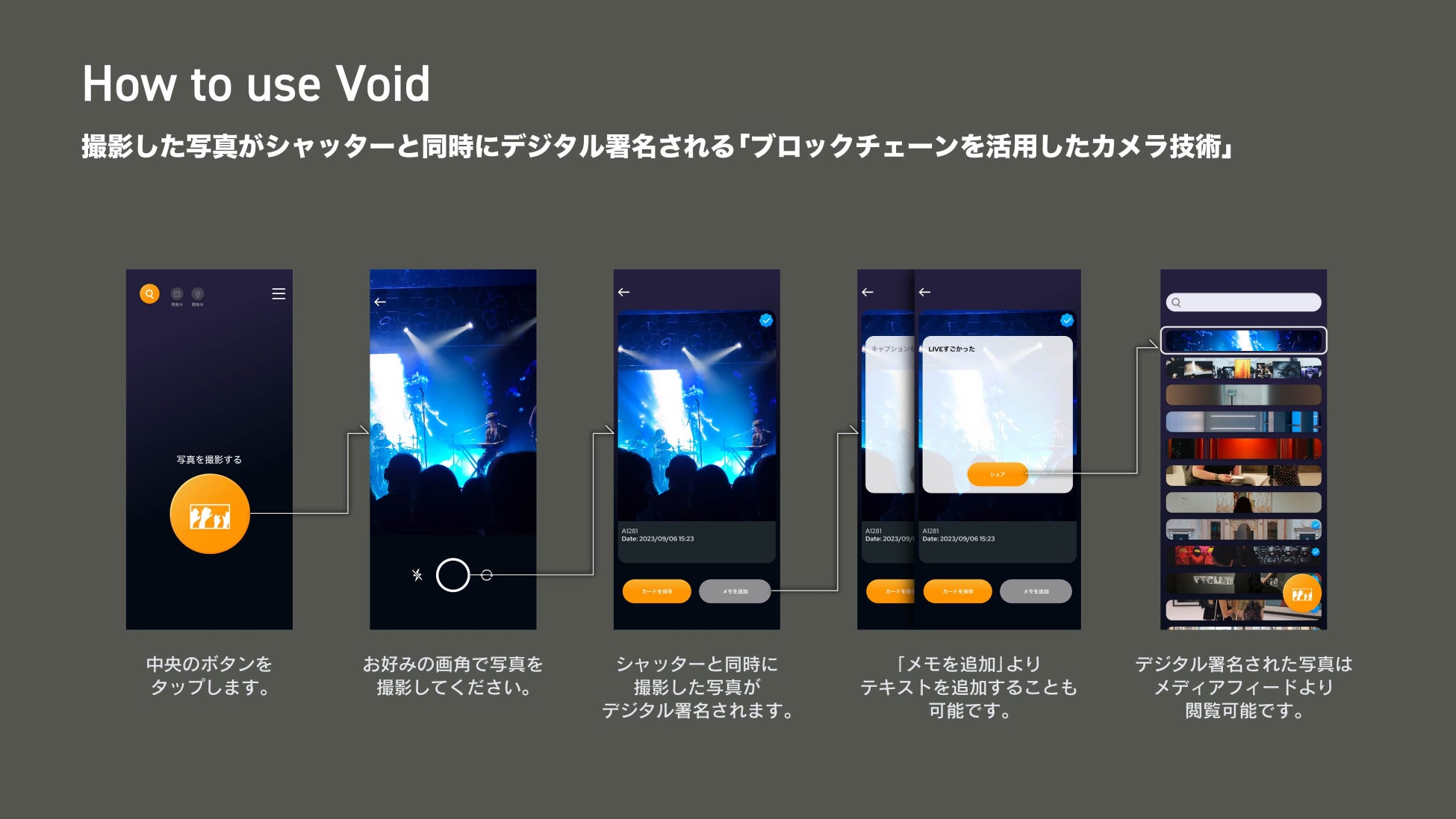 そこで、撮影した写真がシャッターと同時にデジタル署名(独自開発)される「ブロックチェーンを活用したカメラ技術」を開発しました。