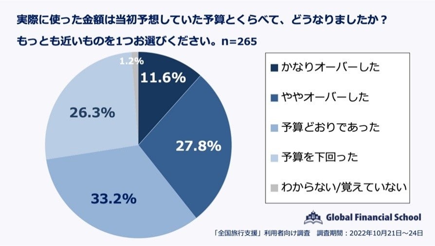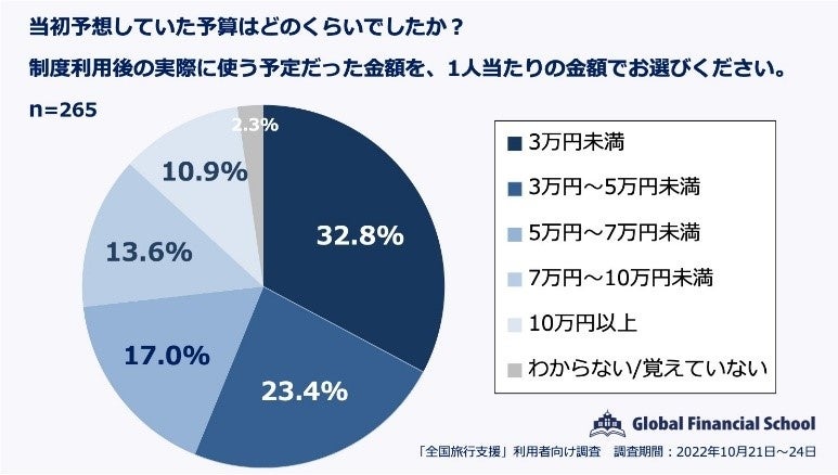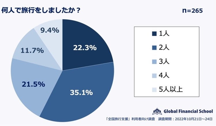 業界最多の講座数を誇る日本最大規模の金融オンラインスクール「グローバルファイナンシャルスクール」(東京都港区、市川雄一郎校長)は、10 月 11 日から開始された「全国旅行支援」を利用して旅行をしたと回答した全国 20〜60 代の男女 265 名にアンケートを行いました。