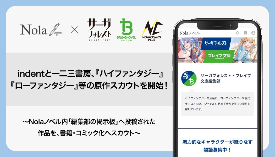 会員数40万人を超える創作プラットフォーム「Nola(ノラ)※1」を提供する株式会社indent(本社:神奈川県相模原市、代表取締役社長:釜形勇気 以下、「indent」)と、「サーガフォレスト」「ブレイブ文庫」や「コミックポルカ」など多くのエンターテインメント系レーベルを提供する株式会社一二三書房(本社:東京都千代田区、代表取締役社長:辺見 正和 以下:一二三書房)は、indentが運営する「Nolaノベル」で展開する「編集部の掲示板」内において、12月22日(金)より一二三書房のレーベルである「サーガフォレスト・ブレイブ文庫編集部」および「コミックノヴァ編集部」にて投稿作品のスカウトを開始いたしました。