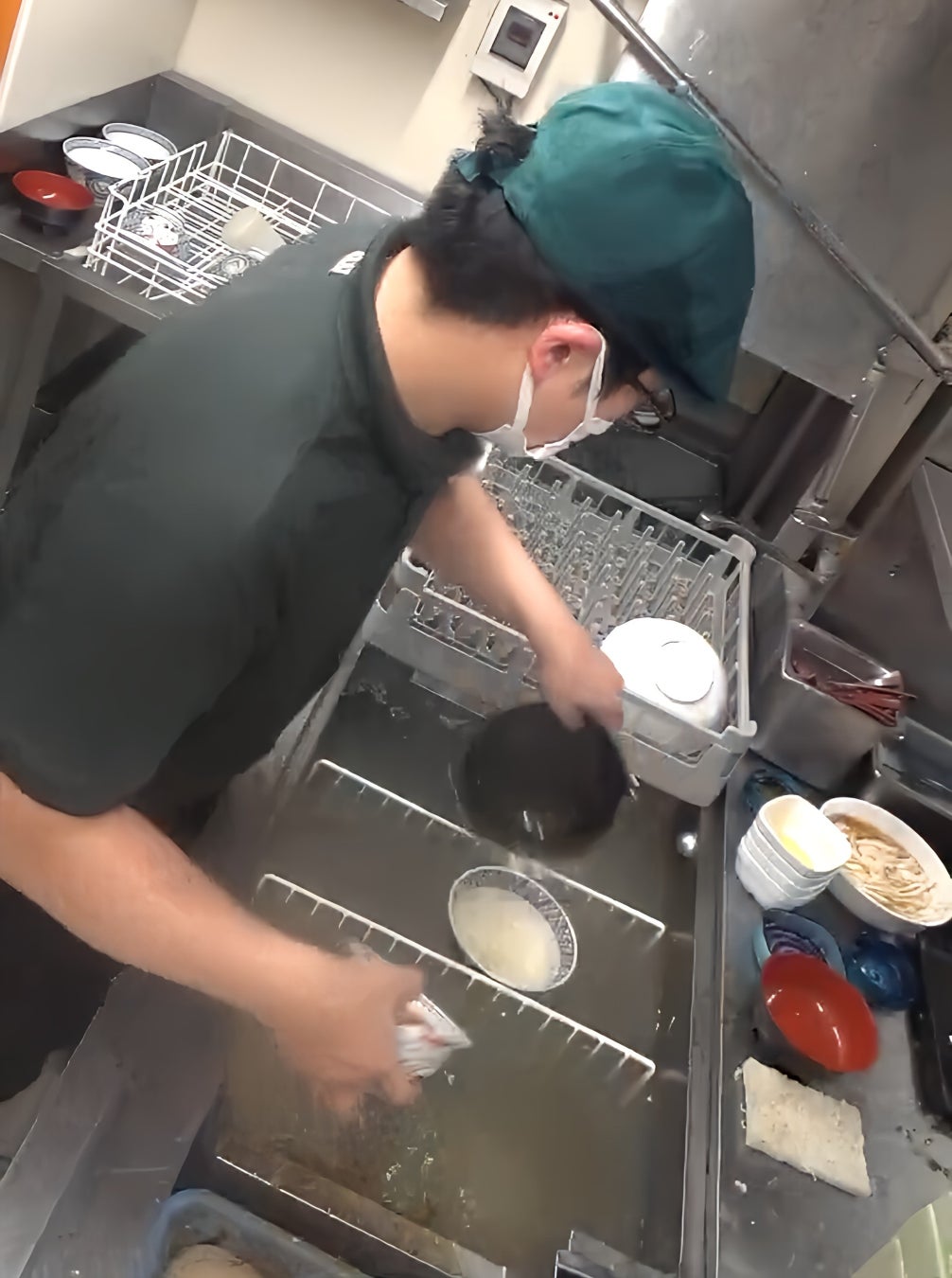 具体的には、従業員が手で、使用後の汚れた食器を、1枚1枚浸漬層に浸して汚れを一部取り除いた後に、食器洗浄機のラックに載せ替え、洗浄を行っています。この時、浸漬層に溜まっている水は、時間の経過とともに濁り汚れていきますが、その汚れた水の中に従業員は手や腕を入れ、食器を掴み、作業を続ける必要があります。汚れた水は油分を多く含み、手荒れの要因にもなるこれらの作業は、汚れにより目視確認が難しいほどに濁った水の浸漬層内で食器が割れていることがあると、気づかずに触れてしまい、怪我をするリスクもあるため、自動化のニーズが根強くありました。