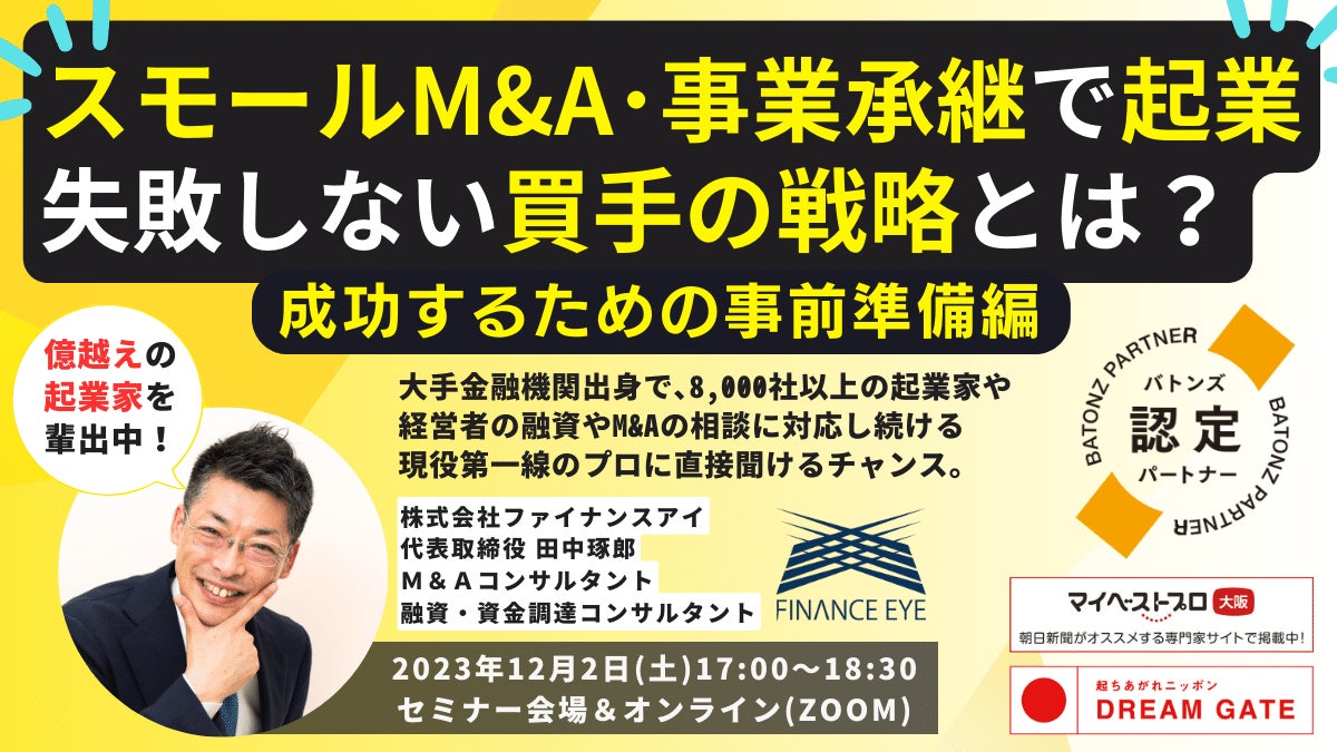 12月2日開催|個人もスモールM&A・事業承継で起業!失敗しない買手の戦略とは?リサーチとプランの事前準備編